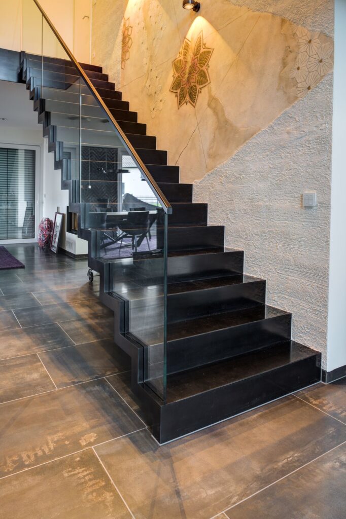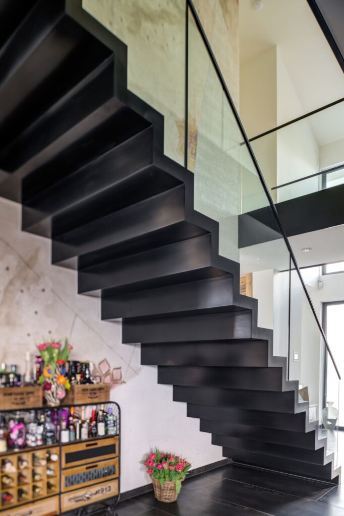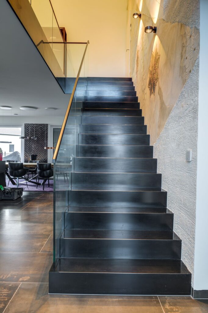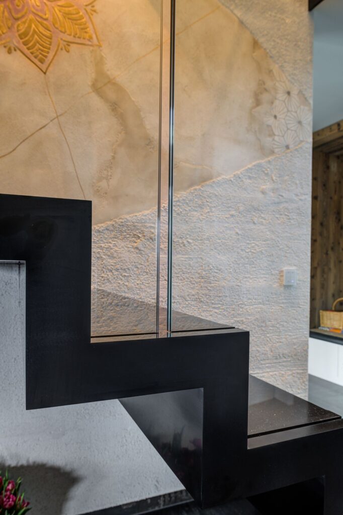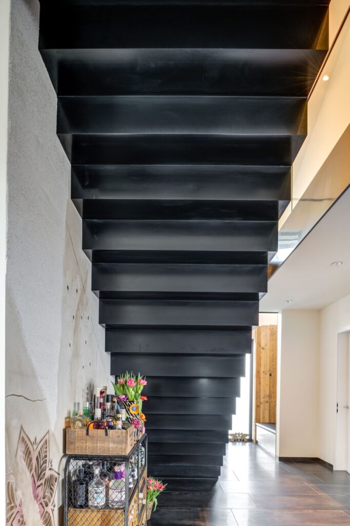 Schwarzes Corian, matt poliert. 1,20 m breite Faltwerktreppe, begleitet von plastischer Wandgestaltung – ein skulpturaler Blickfang.