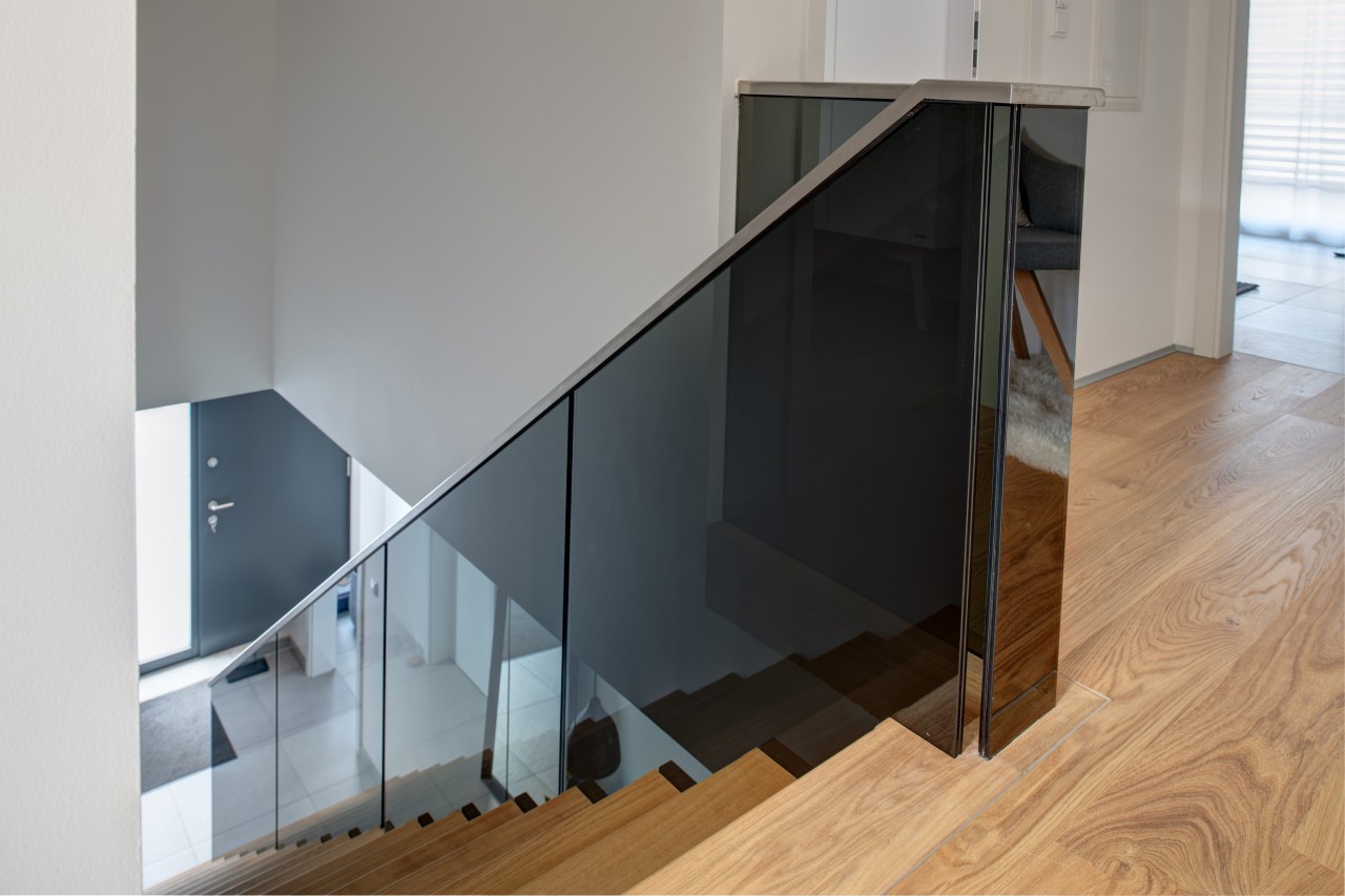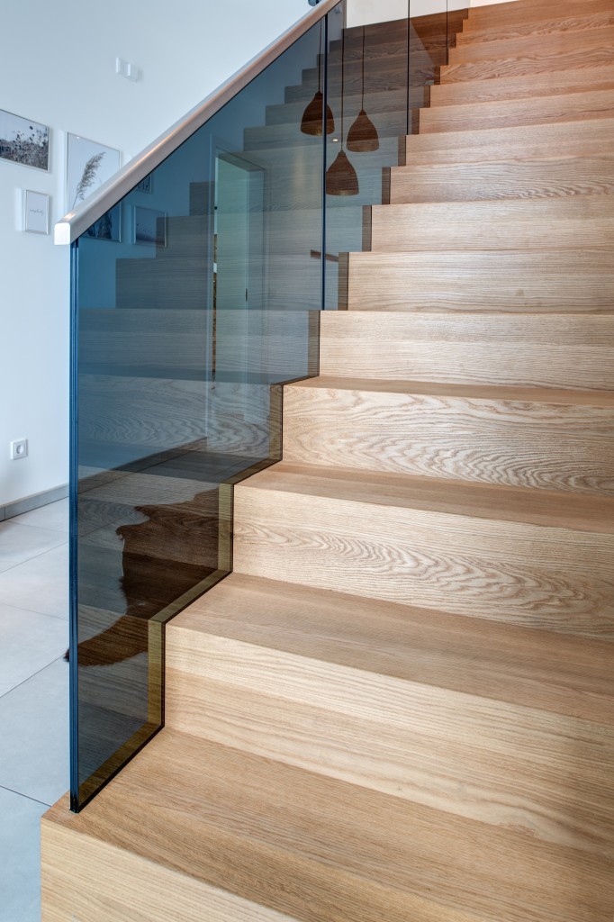 Eine edle Faltwerktreppe aus Eiche, veredelt durch getöntes Glas und einen minimalistischen Edelstahlhandlauf. Diese Kombination verbindet natürliche Wärme mit moderner Klarheit – ein harmonischer Mix, der dem Raum Tiefe und Eleganz verleiht.