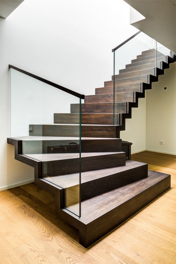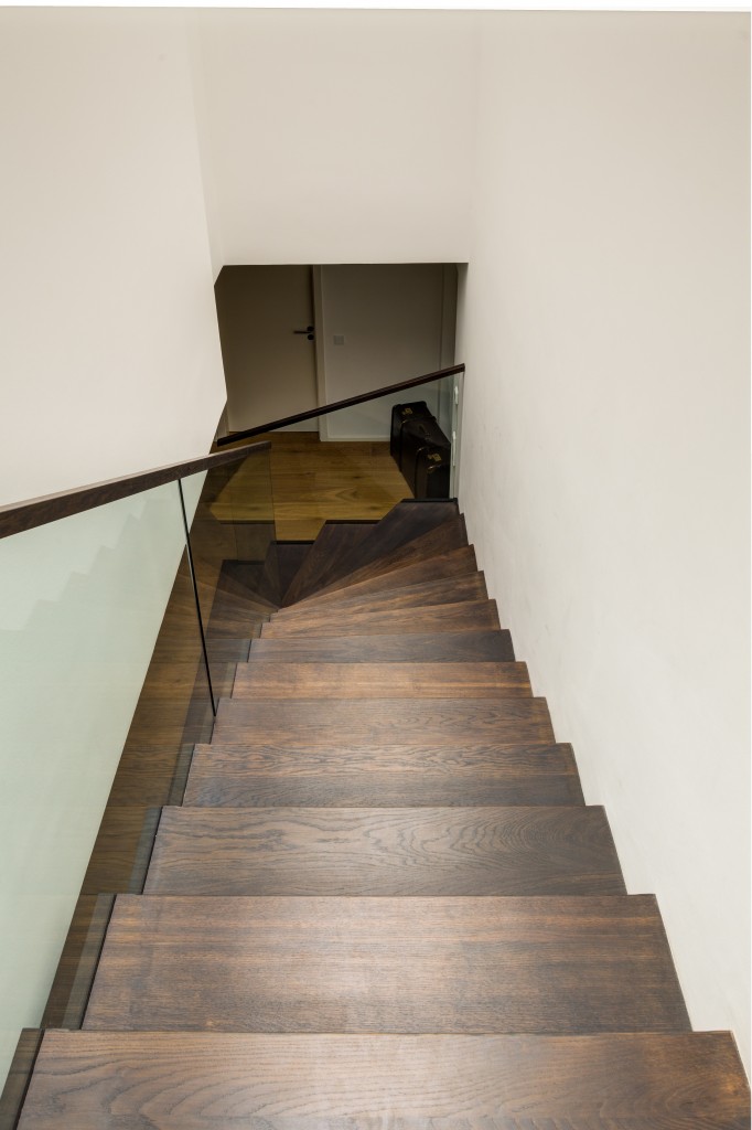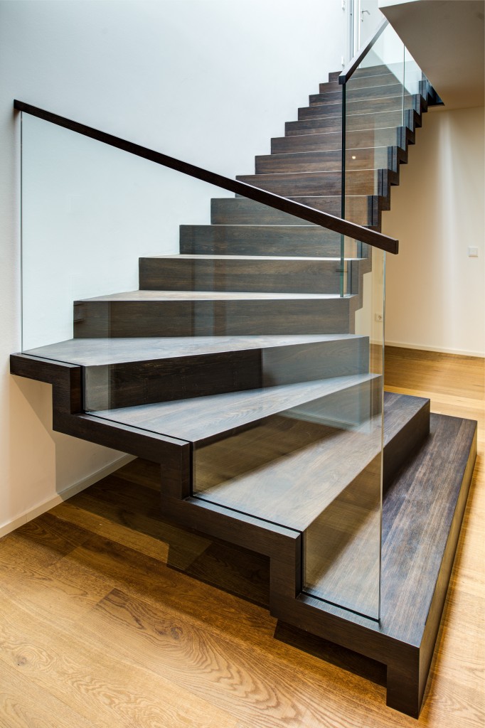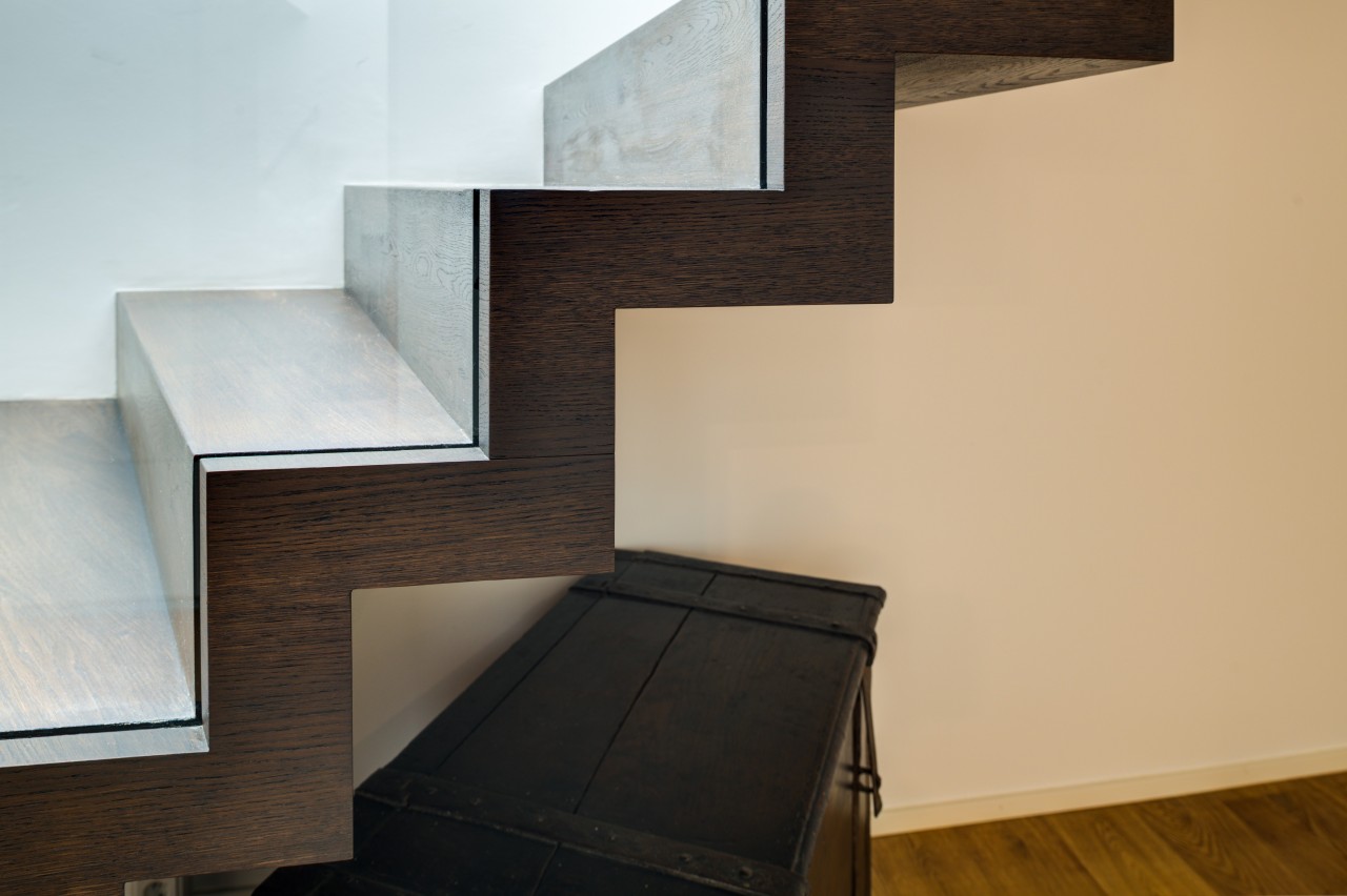 Faltwerk in geölter Räuchereiche mit Glasgeländer und Holzhandlauf. Die ersten zwei Stufen als Blockstufe ausgeführt – inspiriert von unserer Siegertreppe 2019.