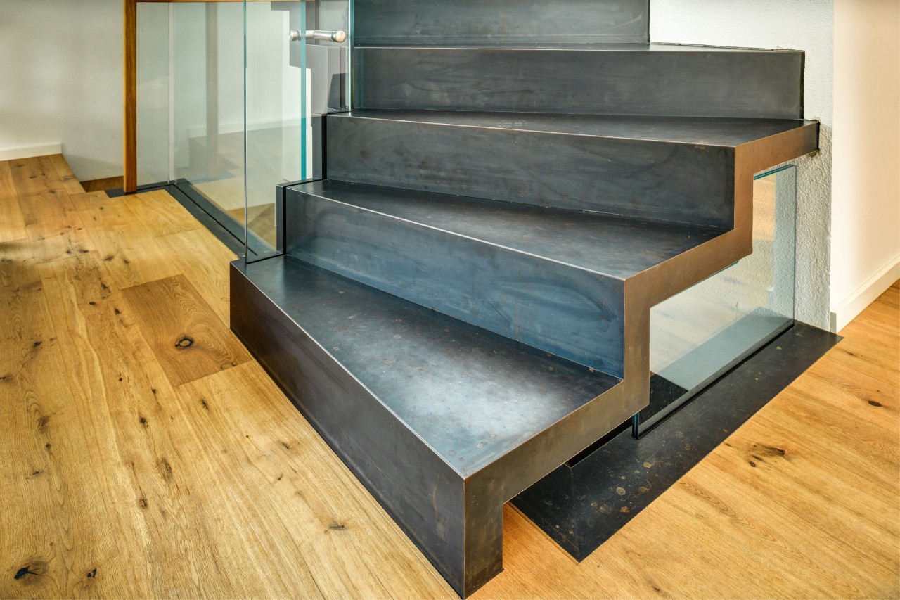 Faltwerktreppe Blaustahl “a touch of loft”! Um hier den industriellen Charakter mit Wohnhausambiente zu verbinden, haben wir auf