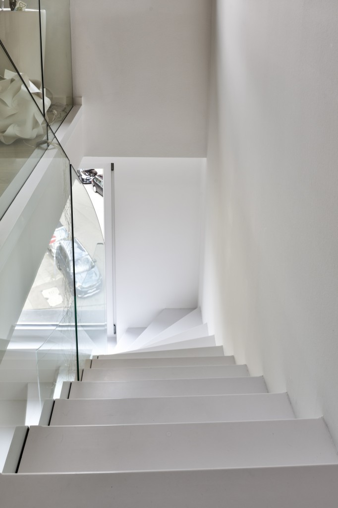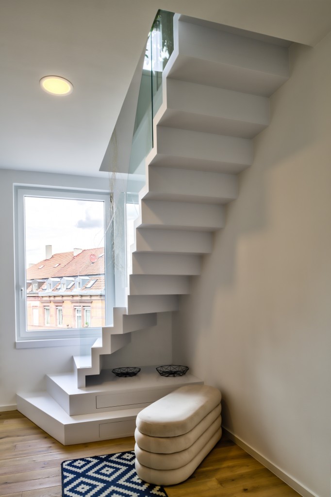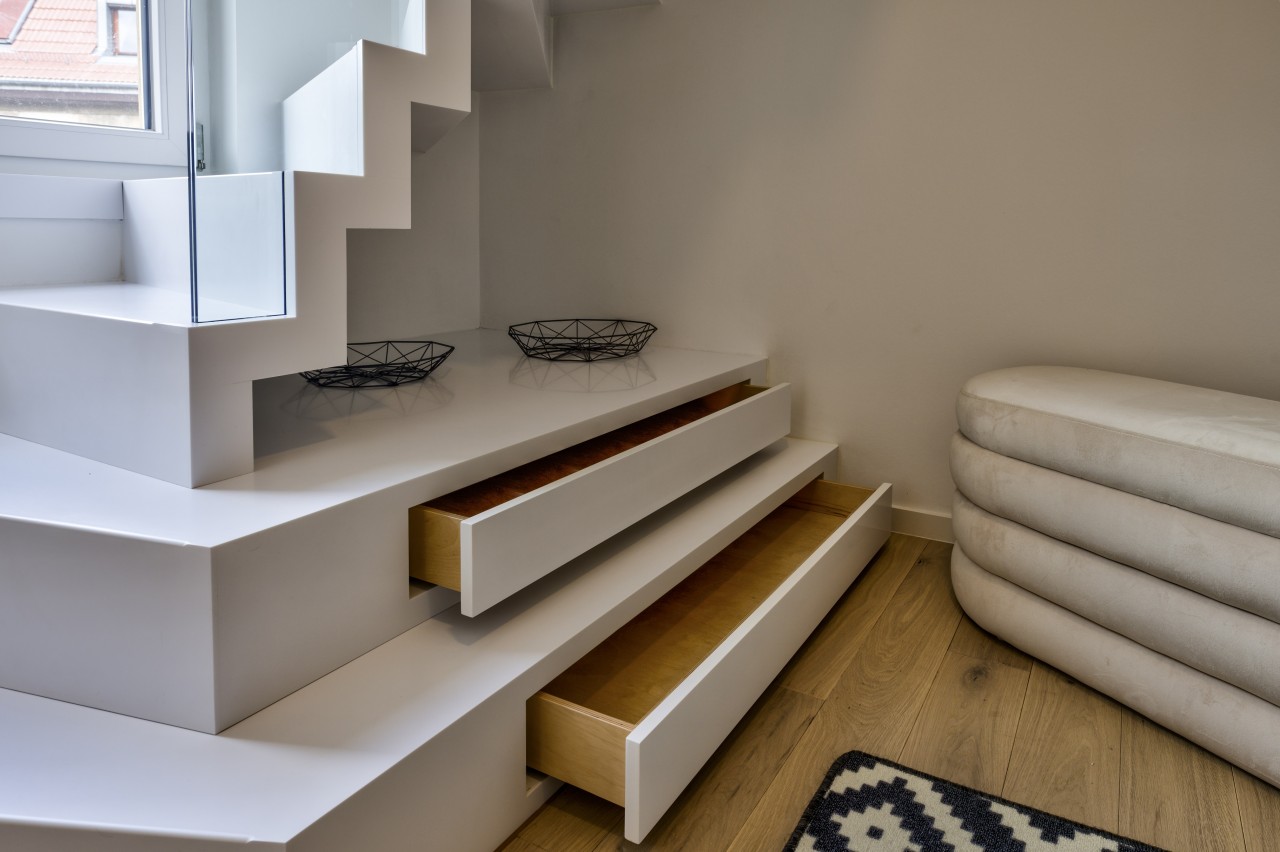 Eine puristische Faltwerktreppe aus Corian „Designerwhite“ im Geschäftshaus: Elegantes Weiß, konsequent durchgezogen mit „Soft‑Touch“ Schubladen – Funktion trifft auf minimalistischen Stil.