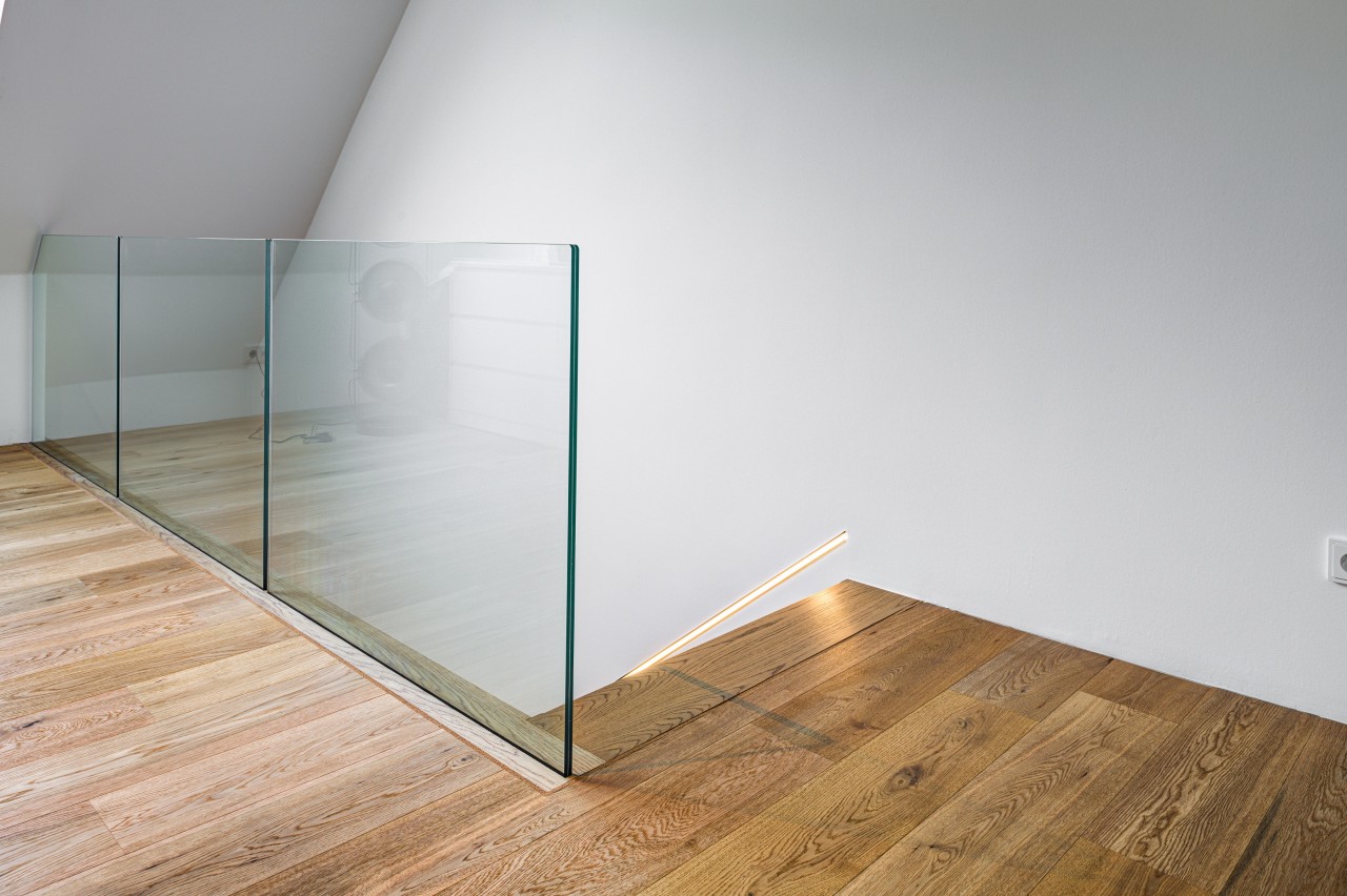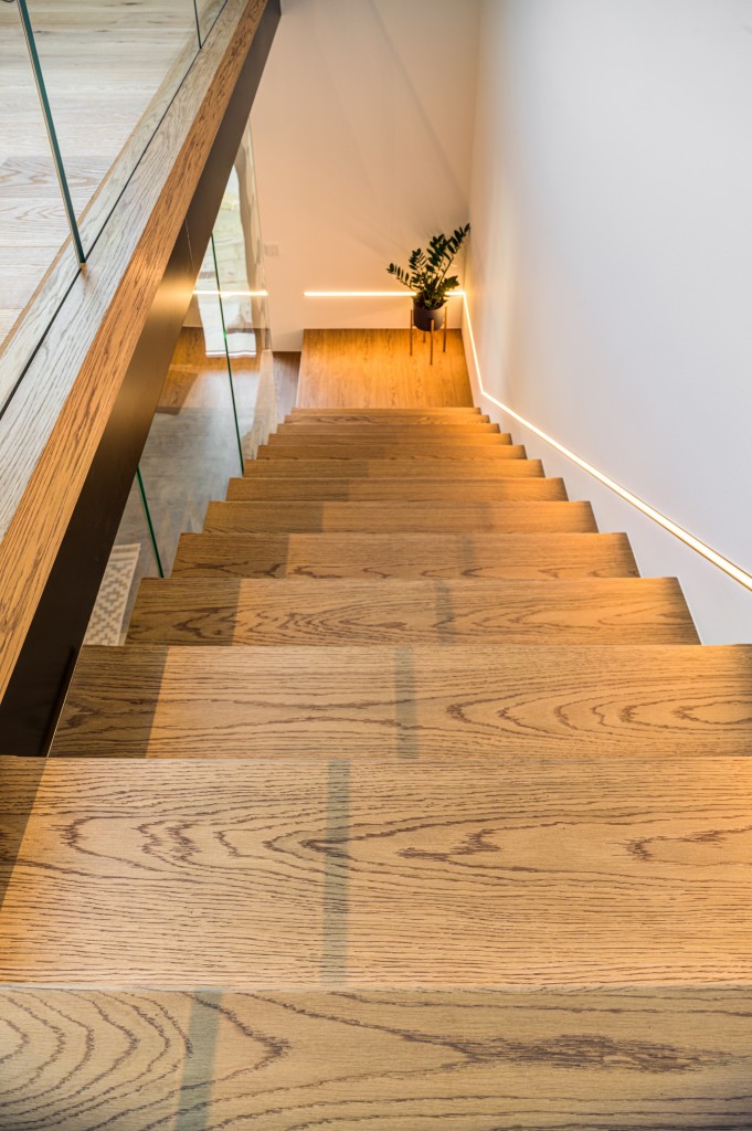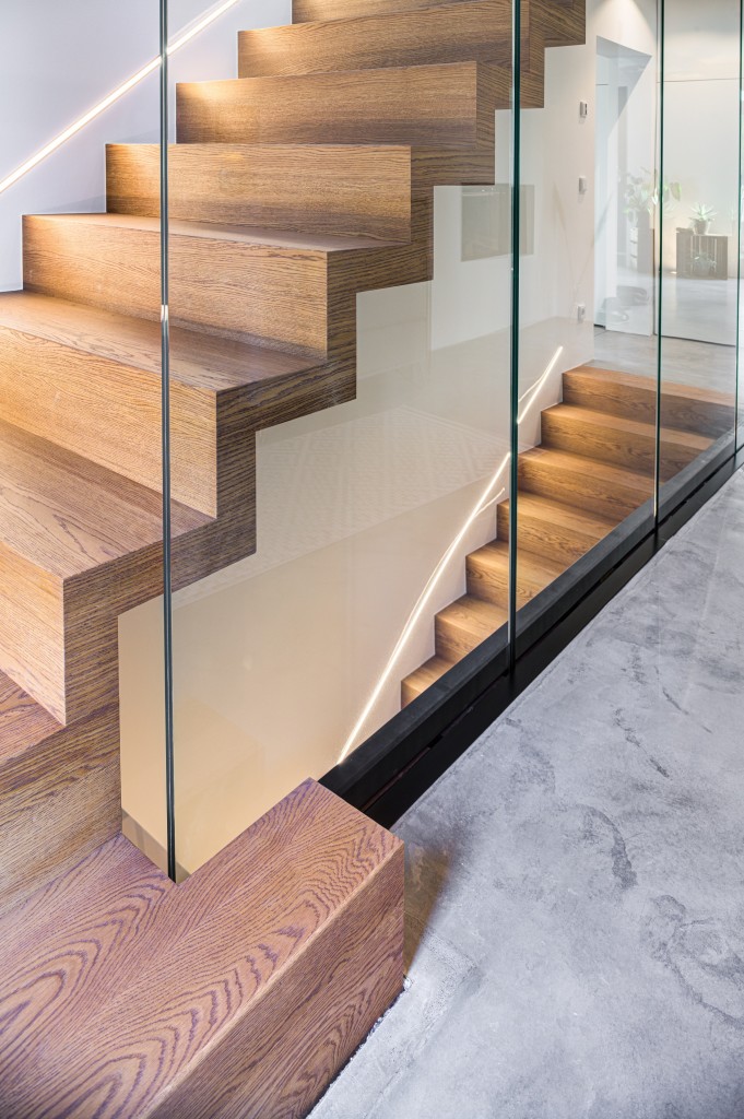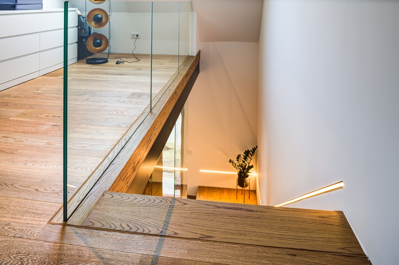 Minimalistischer geht es kaum: Eine Faltwerktreppe in Eiche, ganz ohne Wandanbindung hinten und links. Als tragende Struktur dient eine 28 mm starke VSG-Glaswand, an die die Treppe elegant gekoppelt ist – ein Meisterstück des puristischen Designs