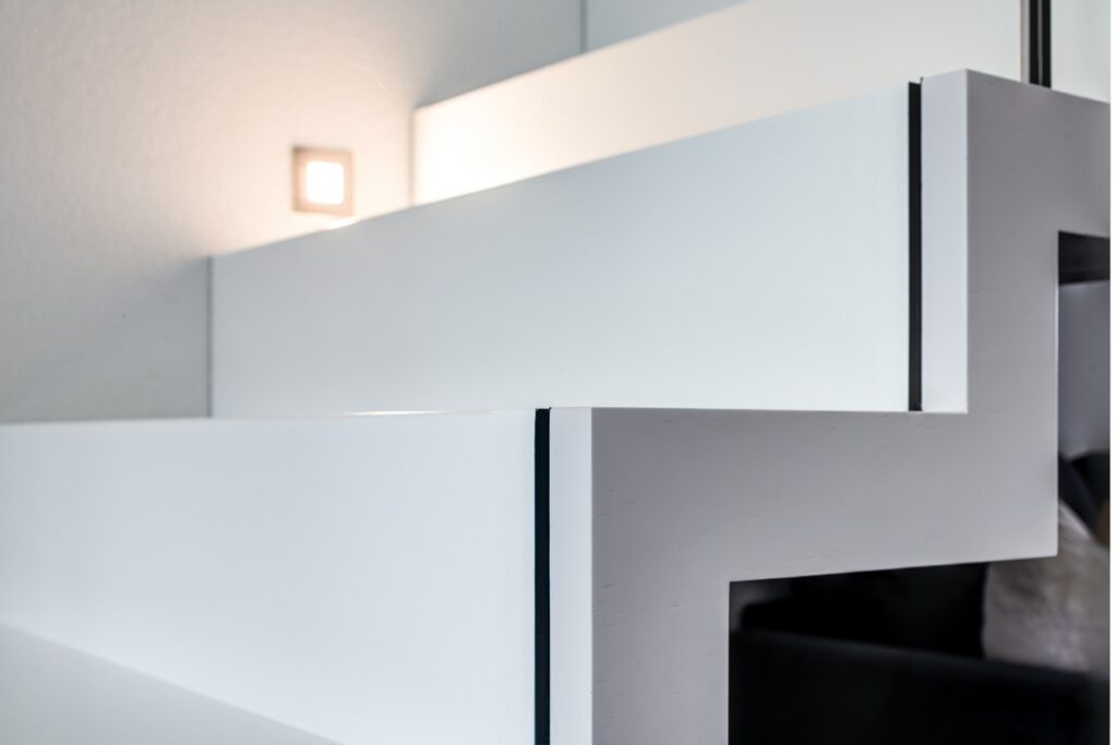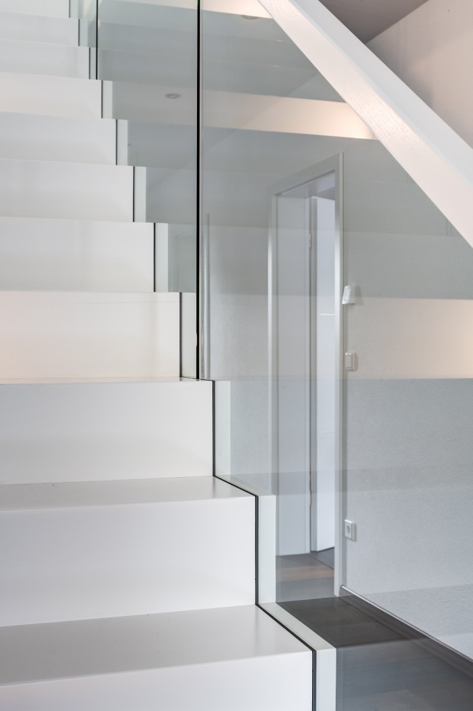 Faltwerktreppe in Eiche, stark weiß pigmentiert und klarlackiert. Die Oberflächenstruktur der Eiche ist sicht- und fühlbar. Geländer aus transparentem Sicherheitsglas 17,5 mm stark und Holzhandlauf.