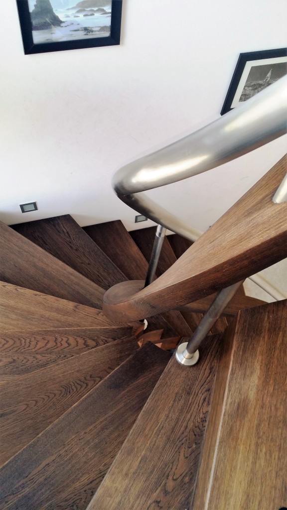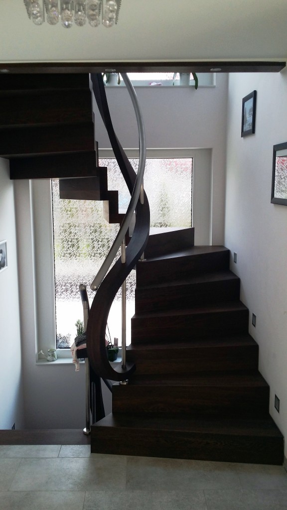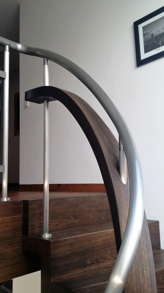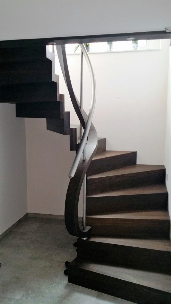 Eine halbgewendelte Faltwerktreppe mit elegantem Innenbogen, die durch ihre fließende Form und klare Linienführung beeindruckt. Das exklusive Wellengeländer aus Holz mit Edelstahlhandlauf macht sie zum stilvollen Highlight jedes Raumes.