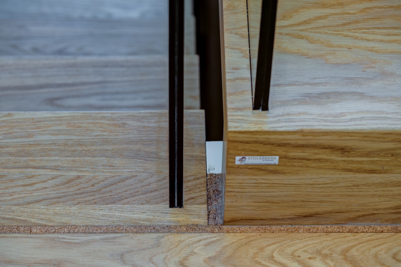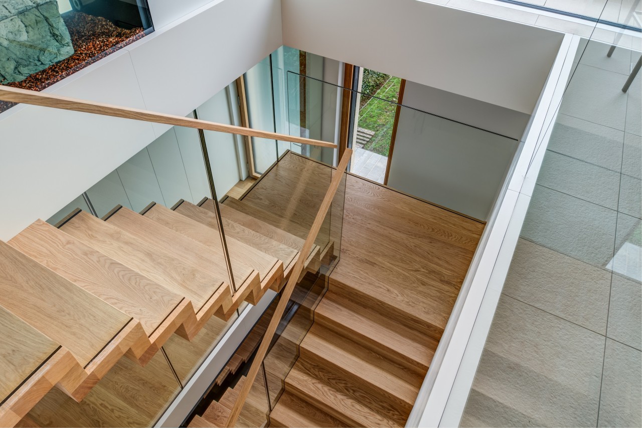 Minimalismus in stilvollem Ambiente. Die Treppe hat innen und an der linken Seite keinerlei Wandanbindung. Als Trägermodul haben wir eine 28mm TVG-Glaswand installiert und die Treppe daran gekoppelt.