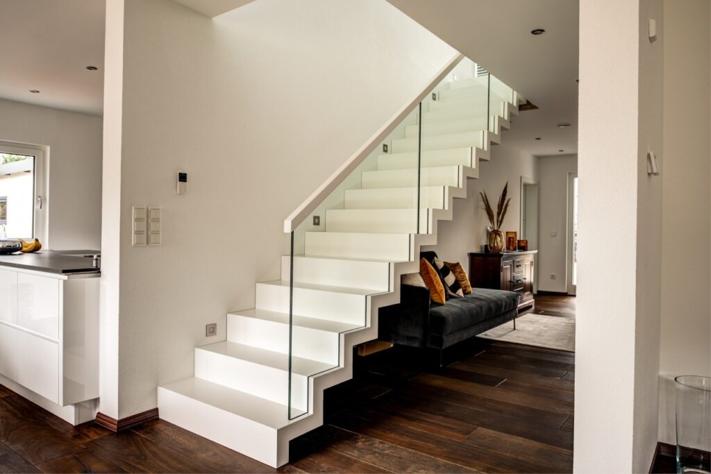 Faltwerk 2019 Homburg/Saar, Deutschland Eine Faltwerktreppe mit makelloser Oberfläche aus weißem Corian, kombiniert mit transparentem Glasgeländer und einem Handlauf in gebürstetem Edelstahl – minimalistisch, edel und präzise. Jetzt Angebot für ihre Treppe anfordern. Unverbindlich und kostenfrei.