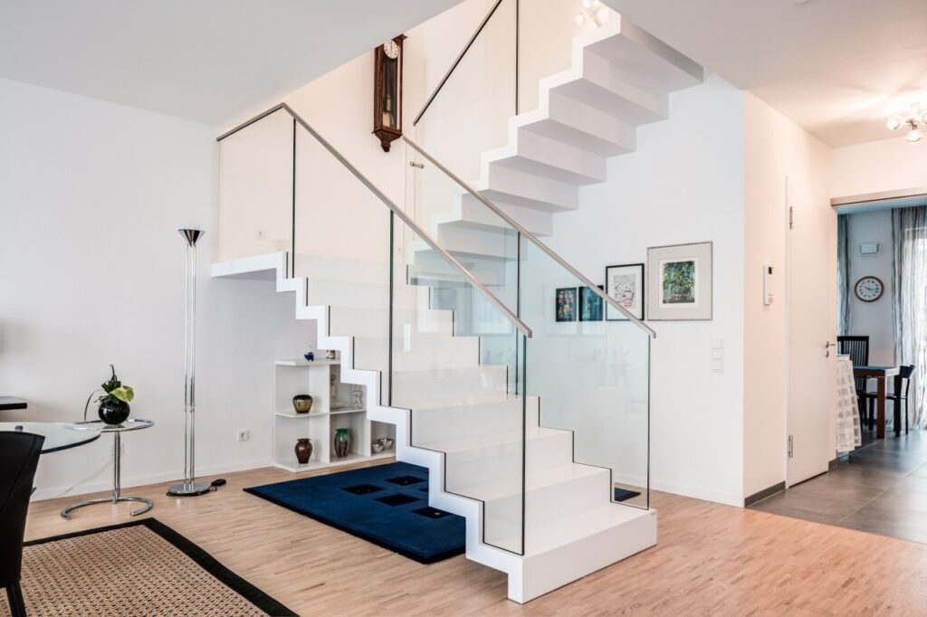Faltwerktreppe in Corian weiß mit Podest