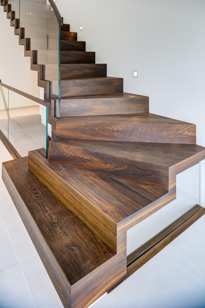 Viertelgewendelte Faltwerktreppe in Räuchereiche mit breitem Antritt