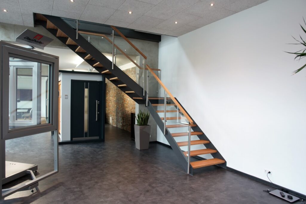 Wangen 2017 Rheinstetten, Deutschland Flachstahlwangentreppe mit Stufen und Handläufen aus Eiche. Oberfläche Stahlwangen in anthrazit DB 703, Geländer mit Edelstahlpfosten und Füllung aus VSG-Glas. Jetzt Angebot für ihre Treppe anfordern. Unverbindlich und kostenfrei.